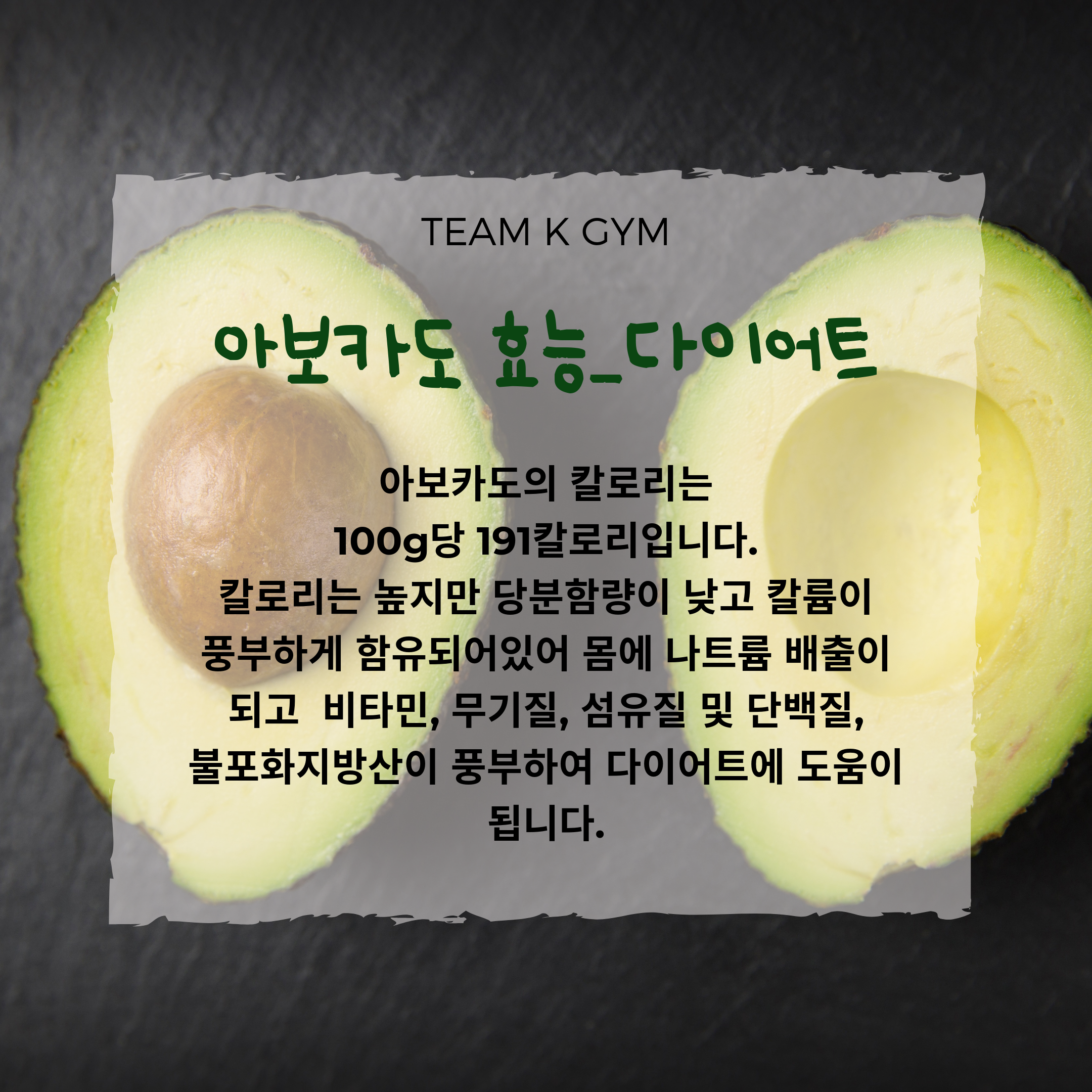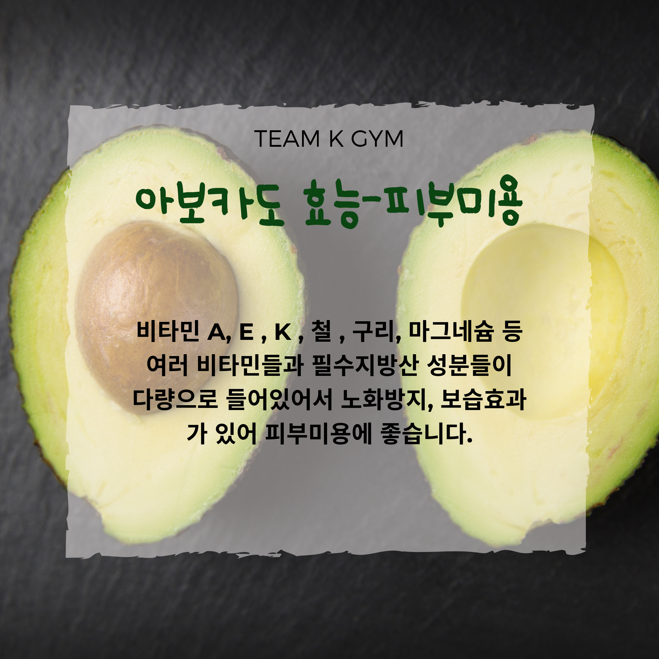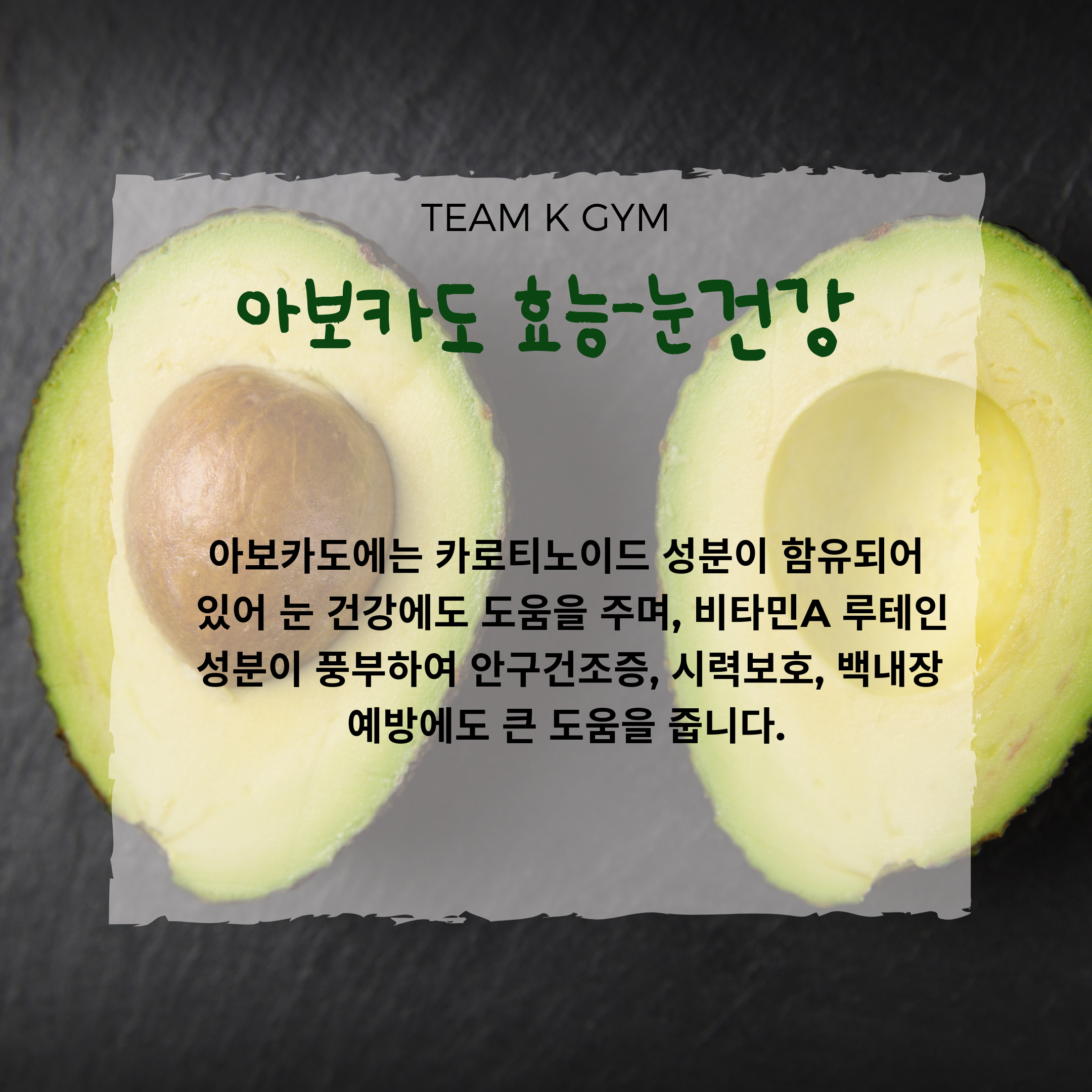 아보카도에는 카로티노이드 성분이 함유되어 있어 눈 건강에도 도움을 주며, 비타민A 루테인 성분이 풍부하여 안구건조증, 시력보호, 백내장 예방에도 큰 도움을 줍니다