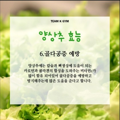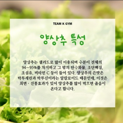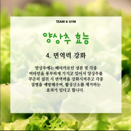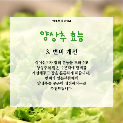 개선해주고 장을 튼튼하게 해줍니다. 변비가 있는분들에게 양상추를 꾸준히 섭취하시는걸 추천드립니다.