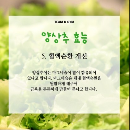 양상추에는 마그네슘이 많이 함유되어 있다고 합니다. 마그네슘은 체내 혈액순환을 원활하게 해주어 근육을 튼튼하게 만들어 준다고 합니다.